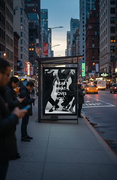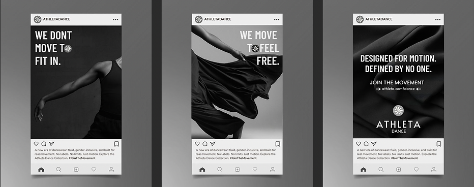 Using black-and-white imagery, we stripped away gendered expectations and highlighted form, fabric, and movement. Minimal copy let the apparel speak for itself. Diverse dancers reinforced that movement is personal and that Athleta supports the dancer, not the stereotype.